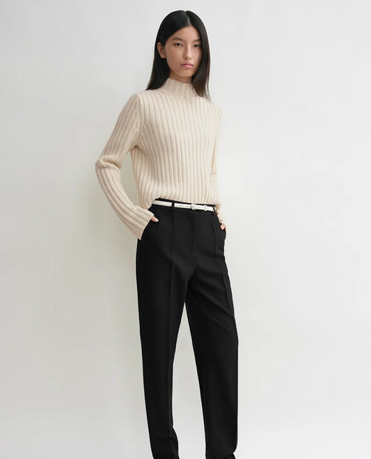 TOTEME Wool Sweater – Black & Beige Rib-Knit Design with Stand Collar & Long Sleeves