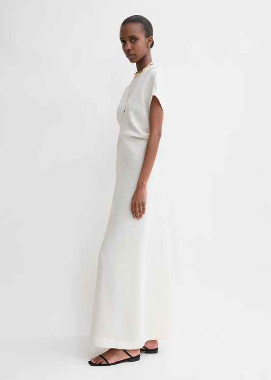 TOTEME Sculpted Waist Dress – Crinkled Viscose Blend, Cap Sleeves & Ankle-Grazing Hem