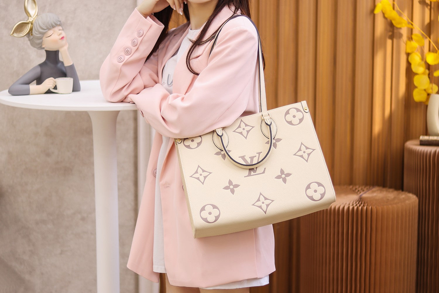 The OnTheGo MM is a medium-sized tote bag with two sets of handles, long and short, for hand and shoulder carry. Fashioned from supple grained cowhide leather, it features a Medium Monogram pattern, printed on and embossed into the leather. The spacious interior, which can hold a laptop and other work essentials, make it a versatile everyday bag.